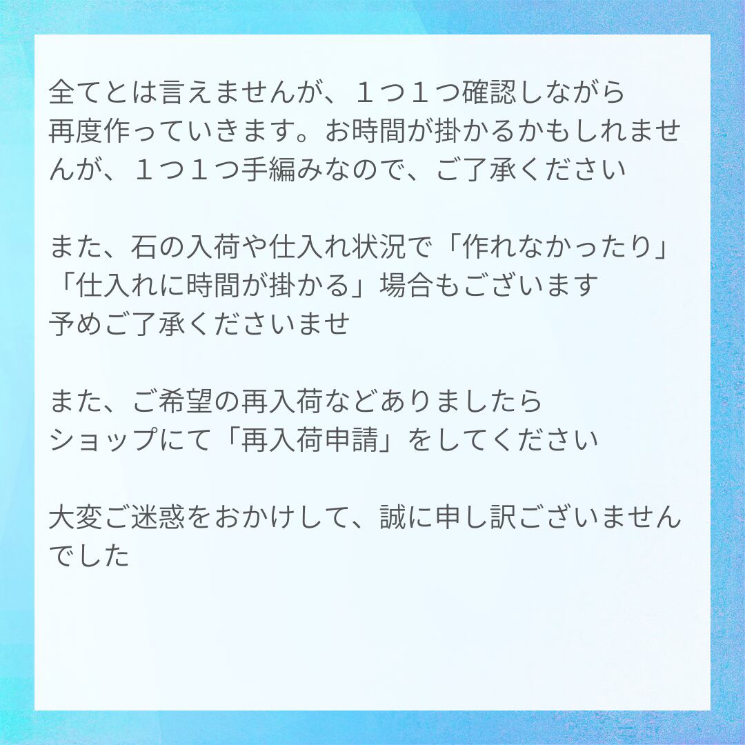 男性サイズ16センチ~18センチ(内径) 女性サイズ14センチ~15.5センチ(内径) チャーム:ステンレス鋼2つ 石のサイズ・ランダムです 【ランダムブレスレット】 宇宙から届く、あなただけの特別な一本。 「パワーストーンを選びたいけれど、どの石が今の自分に合うのかわからない…」 「直感に任せたいけれど、本当に必要なものに出会えるか不安…」 そんな迷いを感じていませんか? 【ランダムブレスレット】は、あなた自身が選ぶのではなく、“宇宙が今のあなたに最も必要なエネルギーを選び出す”という、新しいスタイルのパワーストーンブレスレットです。 個人情報やリーディングは一切必要ありません。 ただ一つ、宇宙を信じて待つだけ。 心を開いて届くのを待てば、思いがけない運命の出会いがあなたを待っています。 ➽ ランダムの理由 「本当に必要とされている石は、ご自身でわかっていますか?」 なぜ石をランダムにするのか? それは、「あなた自身も気付いていない本当に必要なエネルギー」を宇宙が知っているから。 私たちはその宇宙のメッセージを受け取り、インスピレーションを通して、あなたに今一番必要な石を選びます。 ブレスレットが届いた瞬間、「この石だ!」と不思議な感動や懐かしい感覚をきっと味わえるでしょう。 ➽ こんな方におすすめ ・自分に合う石が分からないけど、必要なエネルギーを受け取りたい ・何が届くかわからない、サプライズ感を楽しみたい ・宇宙や直感の導きを感じたい ・大切な人への特別な贈り物を探している ・人生に新たな変化やきっかけを求めている ランダムブレスレットはあえて石の名前は添えていません これは「石の名前」に惑わされない為なんです ランダムは「見て」発送しないで、袋詰めのものをランダムで送っています ➽ 商品内容 宇宙があなたに贈る【世界に一つだけのパワーストーンブレスレット】(1点) ※色・石の種類・デザインは、完全におまかせとなります。 ➽ お届けまでの流れ ① ご注文:ご希望のサイズが「男女」を選びます。 ② 選定:あなたの注文を受けてから、宇宙の直感を通じて石を選定。 ③ 発送:丁寧に梱包し、日本郵便クリックポスト(追跡番号付き)で発送。 ④郵便は、ご自宅のポストに投函されます ⑤ 受け取り:初めて手にする瞬間、感じるままの感覚を大切にしてください。 ➽よくあるご質問 Q. 石の種類やデザインを選べますか? A. お選びいただけません。宇宙の直感を楽しみにお待ちください。 Q. 気に入らなかった場合の返品・交換は? A. ランダム性を特徴とした商品のため、お客様都合の返品・交換はお受けできません。 届いた石が持つ意味やメッセージを、ぜひ深く感じてみてください。 Qサイズは男女決められていますが、もし自分の腕に入らない場合は? A.おりおんブレスレット、ルシファーリゲル兎命が産霊で編み上げるブレスレットは、必ずしも腕に巻くだけではありません。 玄関に「邪気払い」車に「交通安全のお守り」部屋に「運気上昇」にと、当ショップのお客様は色々とお試しされています。 是非、皆様もやってみてください ✨ キャッチコピー 【宇宙にすべてを委ねてみませんか?】 【あなたが選ぶのではなく、石があなたを選ぶ奇跡】 【今、この瞬間、宇宙があなたを見つけます】 【ご購入前にお読みください】 ■ お届けについて 送料:全国一律 200円(梱包代を含みます) 発送:クリックポスト等(ポスト投函・追跡あり) 資源削減のため、明細書は同封しておりません。当店からのメールをご確認ください。 ■ 商品について 天然石を使用しているため、色味や風合いに個体差がございます。 撮影小物は商品に含まれません。 衛生面・エネルギー的な観点から、お客様都合による返品・交換はお受けしておりません。 ■本品は神社の授与品ではありません。特定の神社・団体の公式商品、監修品、提携品ではありません。