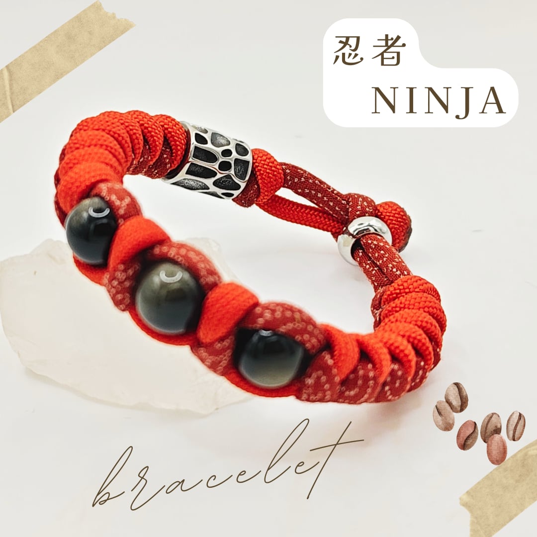 鮮烈な紅色と黒色のパラコードに、銀黒曜石を組み合わせた力強いデザイン。忍者の【情熱・秘めた強さ】を象徴し、内なる炎を呼び覚ます一本です。朱色に近い赤は古来より【魔除け・生命力】を意味し、護符としても大切にされてきました。