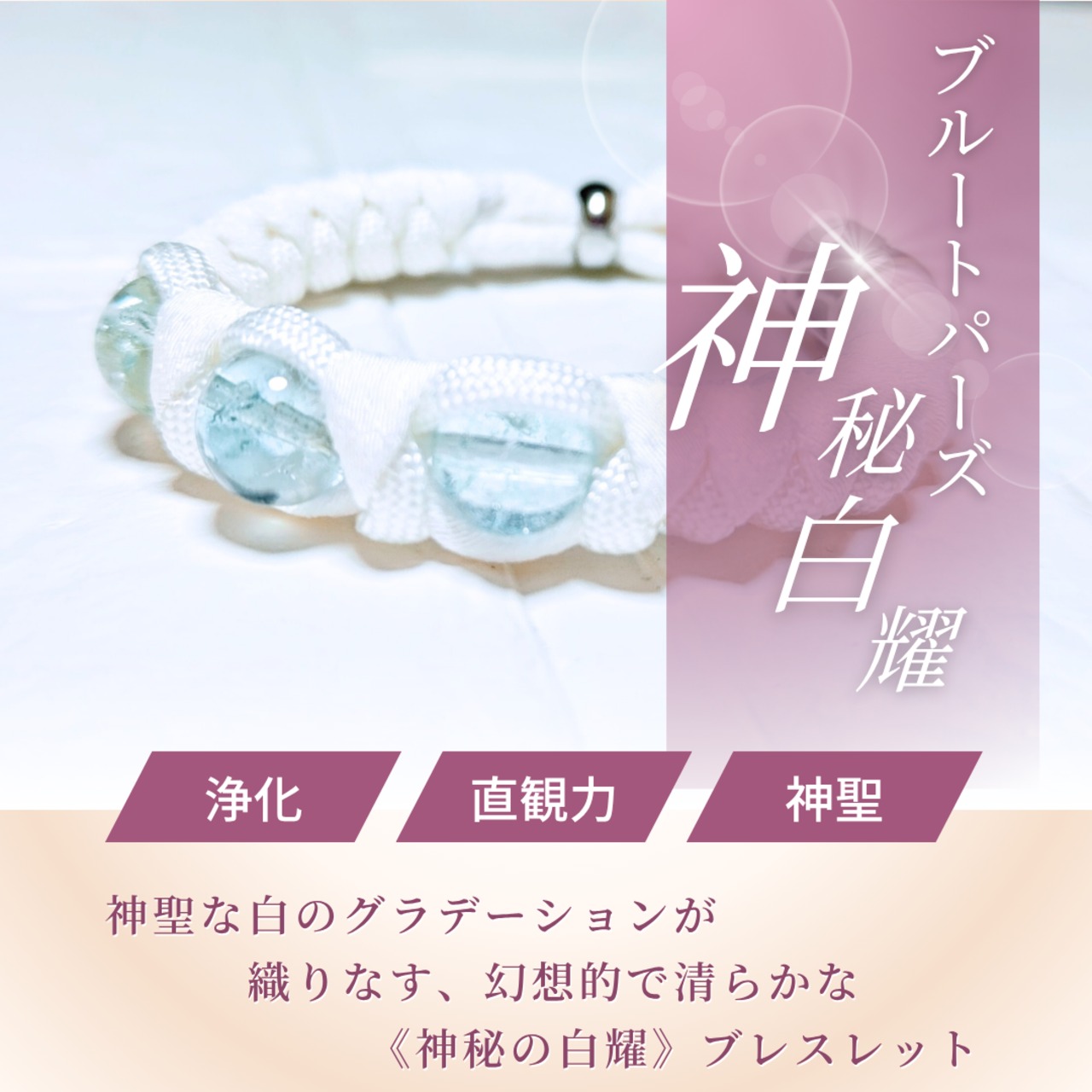 神聖な白のグラデーションが織りなす、幻想的で清らかな《神秘の白耀》ブレスレット。希少なブルートパーズを贅沢に使用し、上品かつ神秘的な魅力に溢れています。