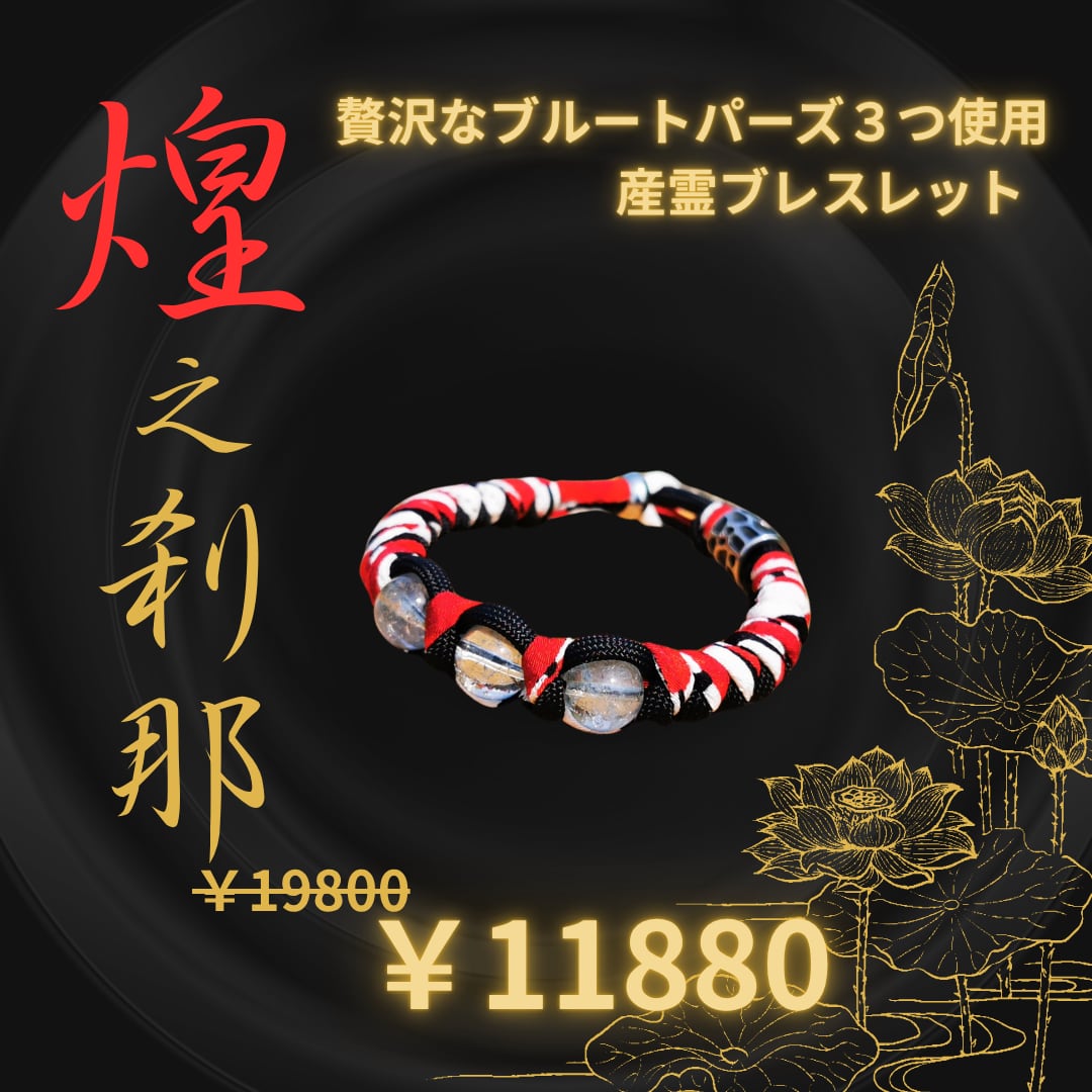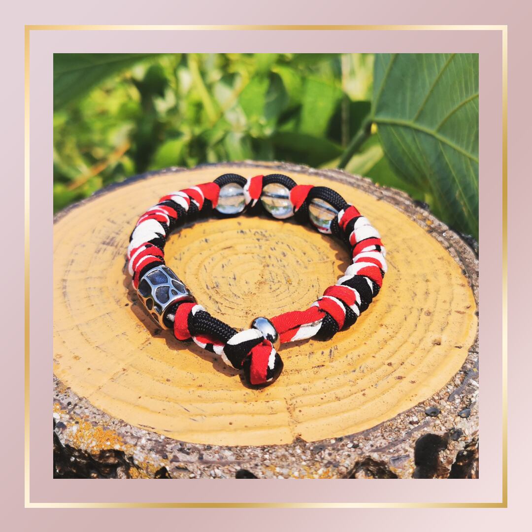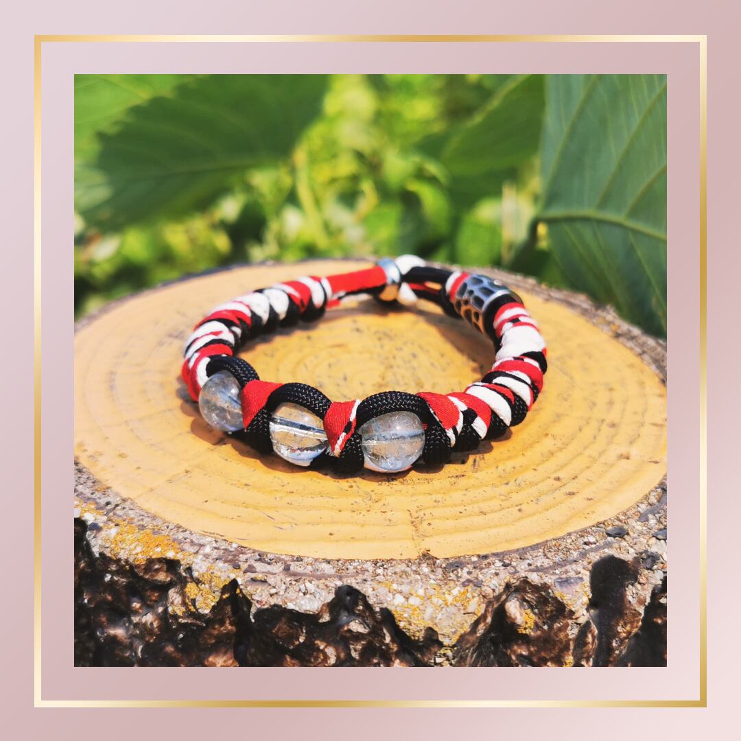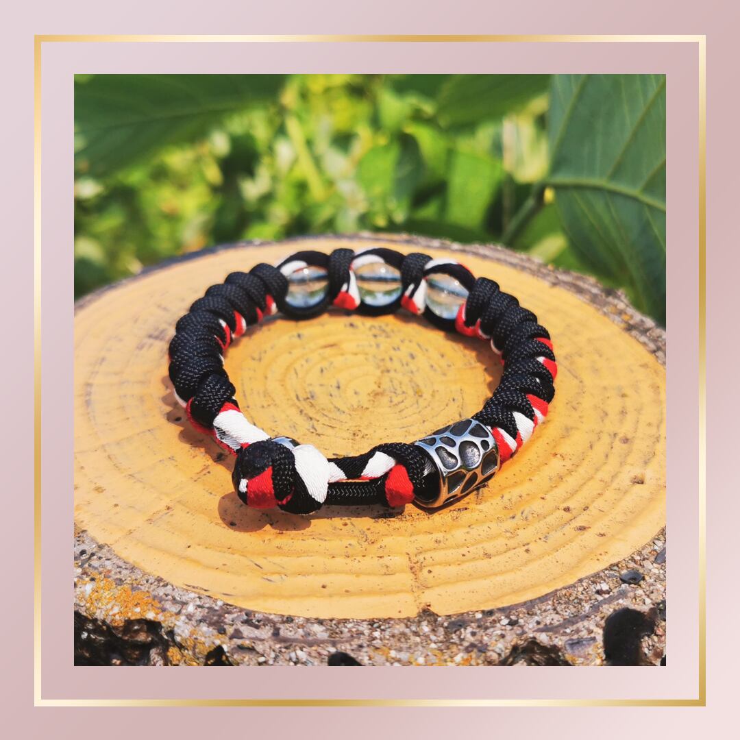 黒パラコードと白赤の和柄紐で、静かに、力強く編み上げました。