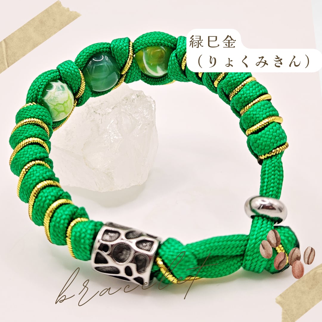 龍の鱗のような美しい網目模様を持つ龍紋瑪瑙を3石あしらい、緑色のパラコードと金紐を産霊で丁寧に編み上げたリメイクバージョン