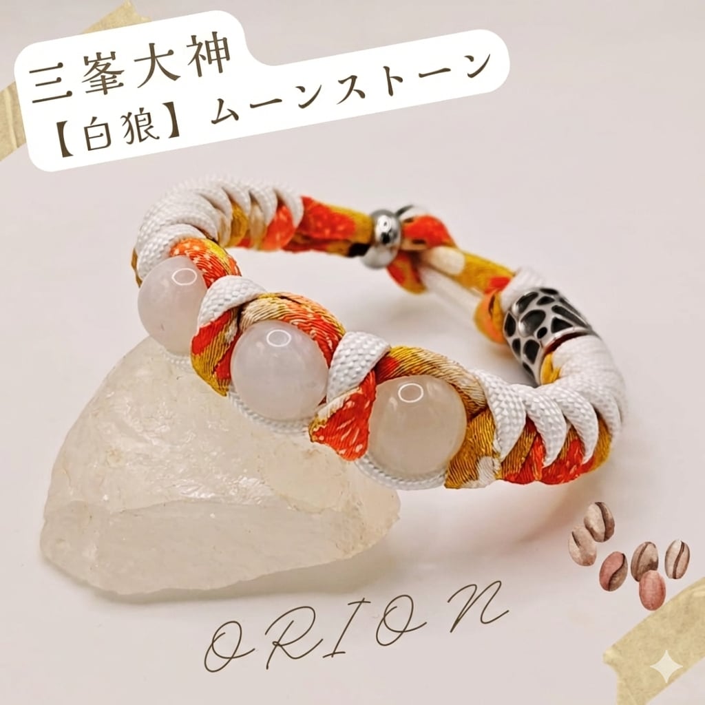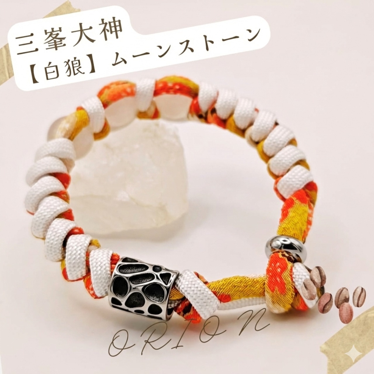 白と橙の編み紐は「太陽と月の調和」。 あなたの心に静かな安らぎと 一歩前へ踏み出す勇気を与えてくれるでしょう。