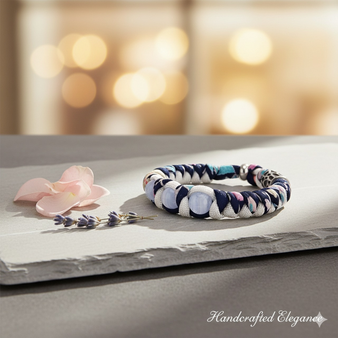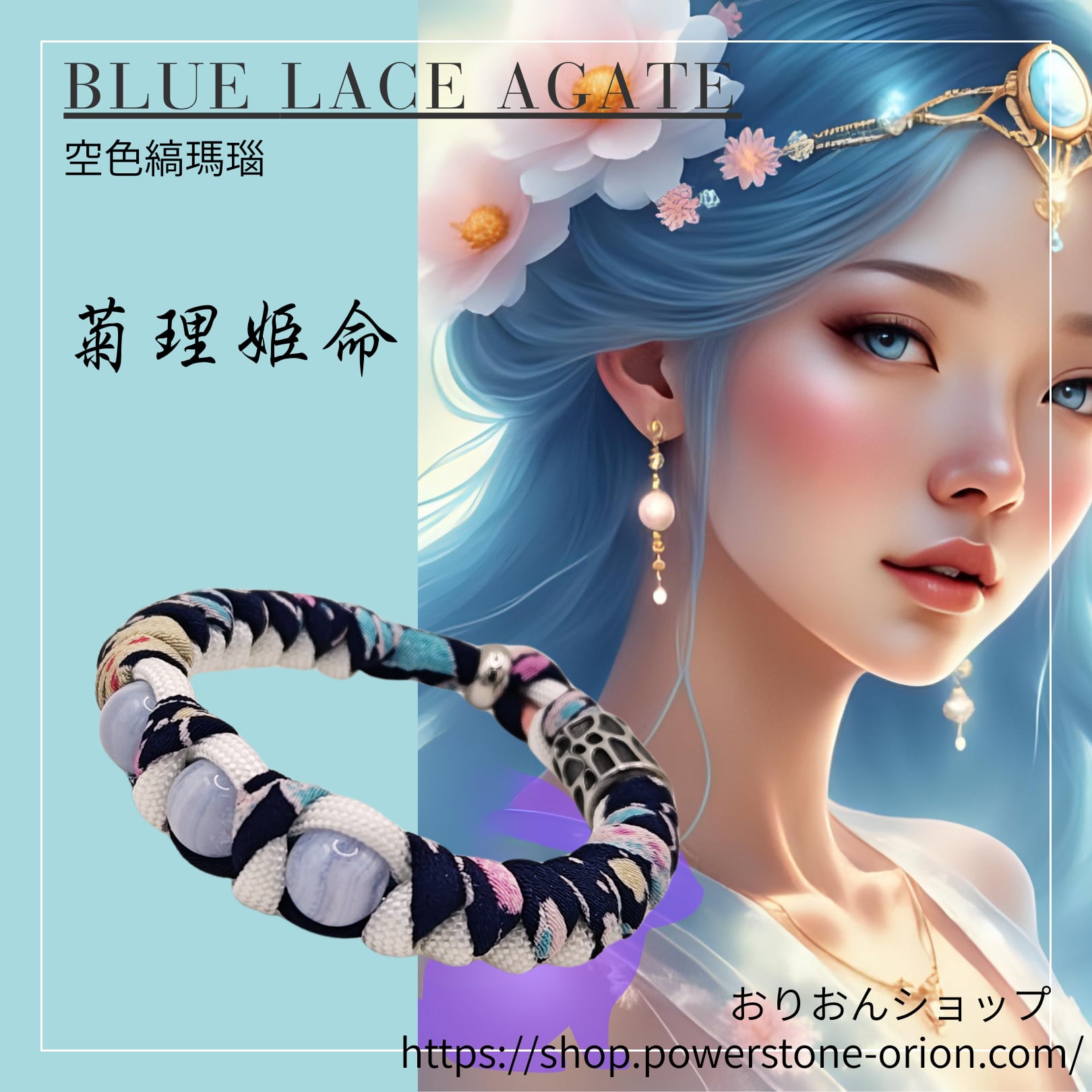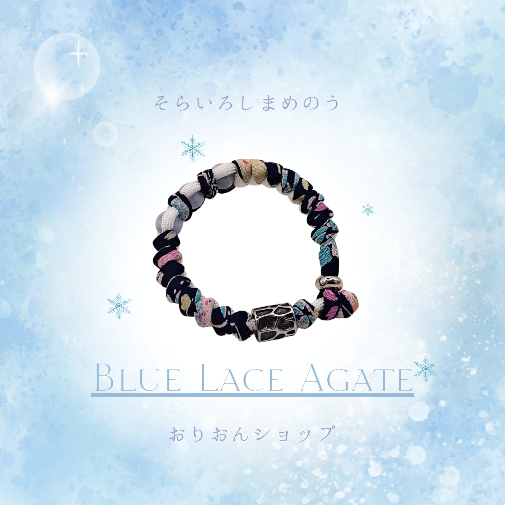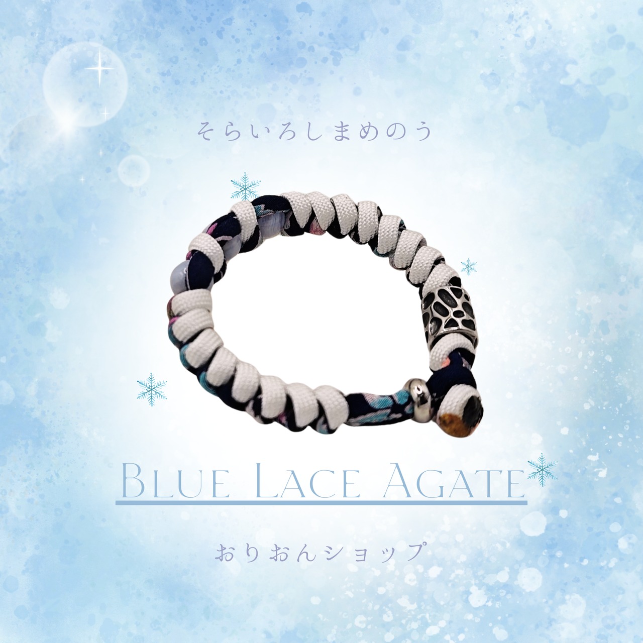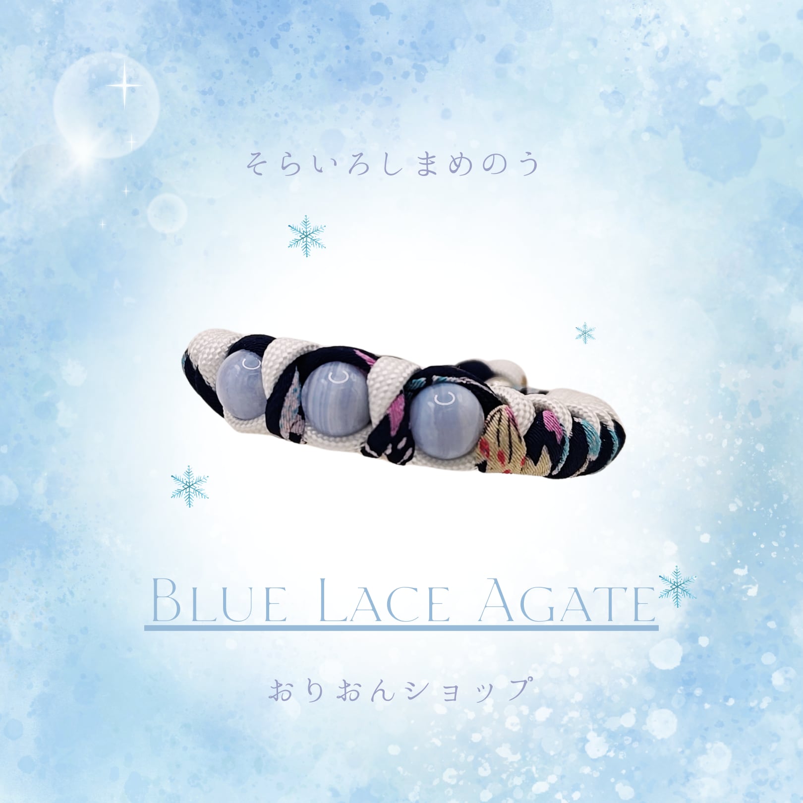 おりおんショップの新作は、 「神の石」とも呼ばれる ブルーレースアゲートを贅沢に使用し、 丈夫なパラコードと 美しい和柄の紐で編み込みました