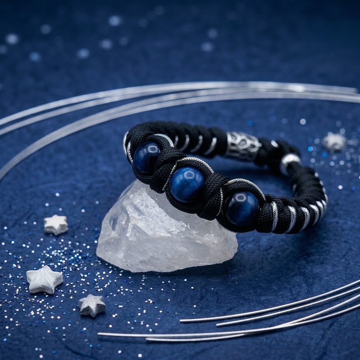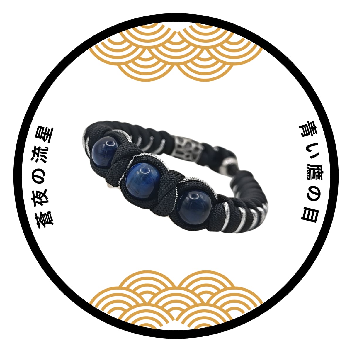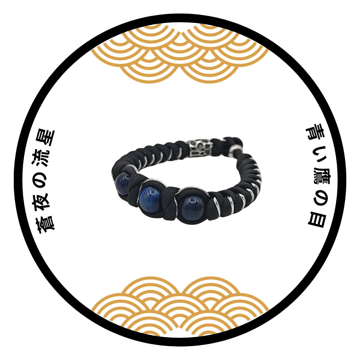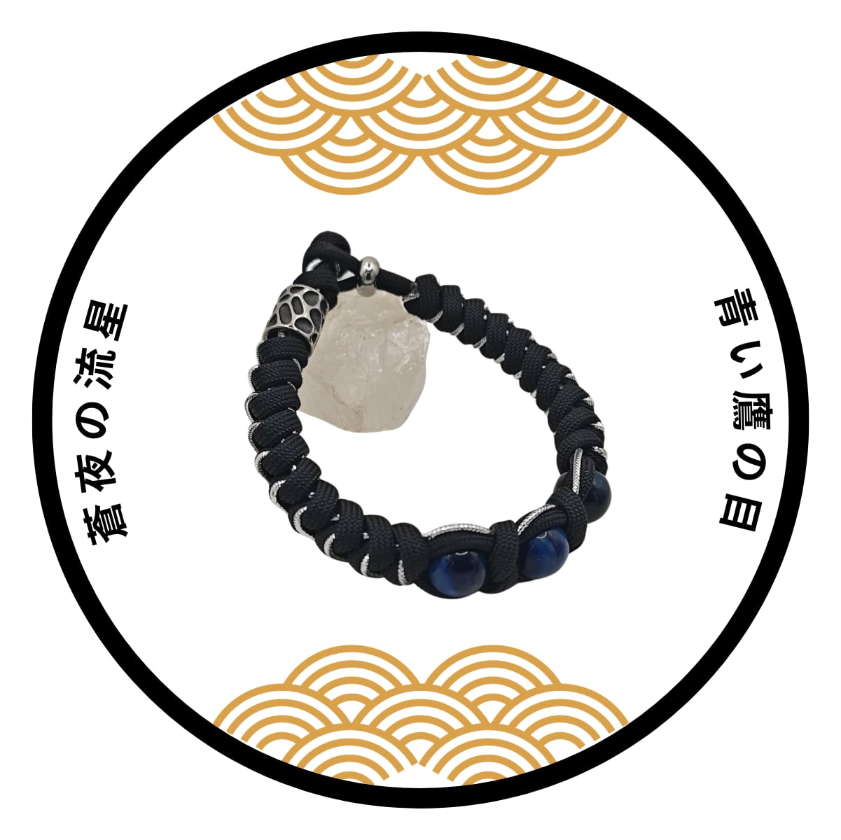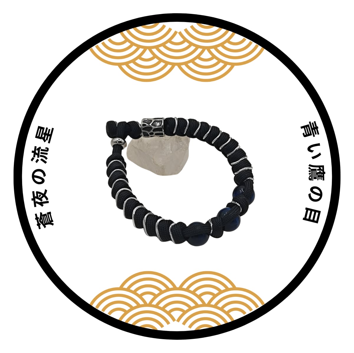 漆黒のパラコードは深い夜の闇を、そこに巻き付く銀の紐は夜空を真っ直ぐに駆ける流星を表します。大玉のブルータイガーアイを合わせ暗闇の中で輝く希望の星を表現しました。迷いのある時に進むべき道を照らす、そんな願いを込めて結び上げた作品です