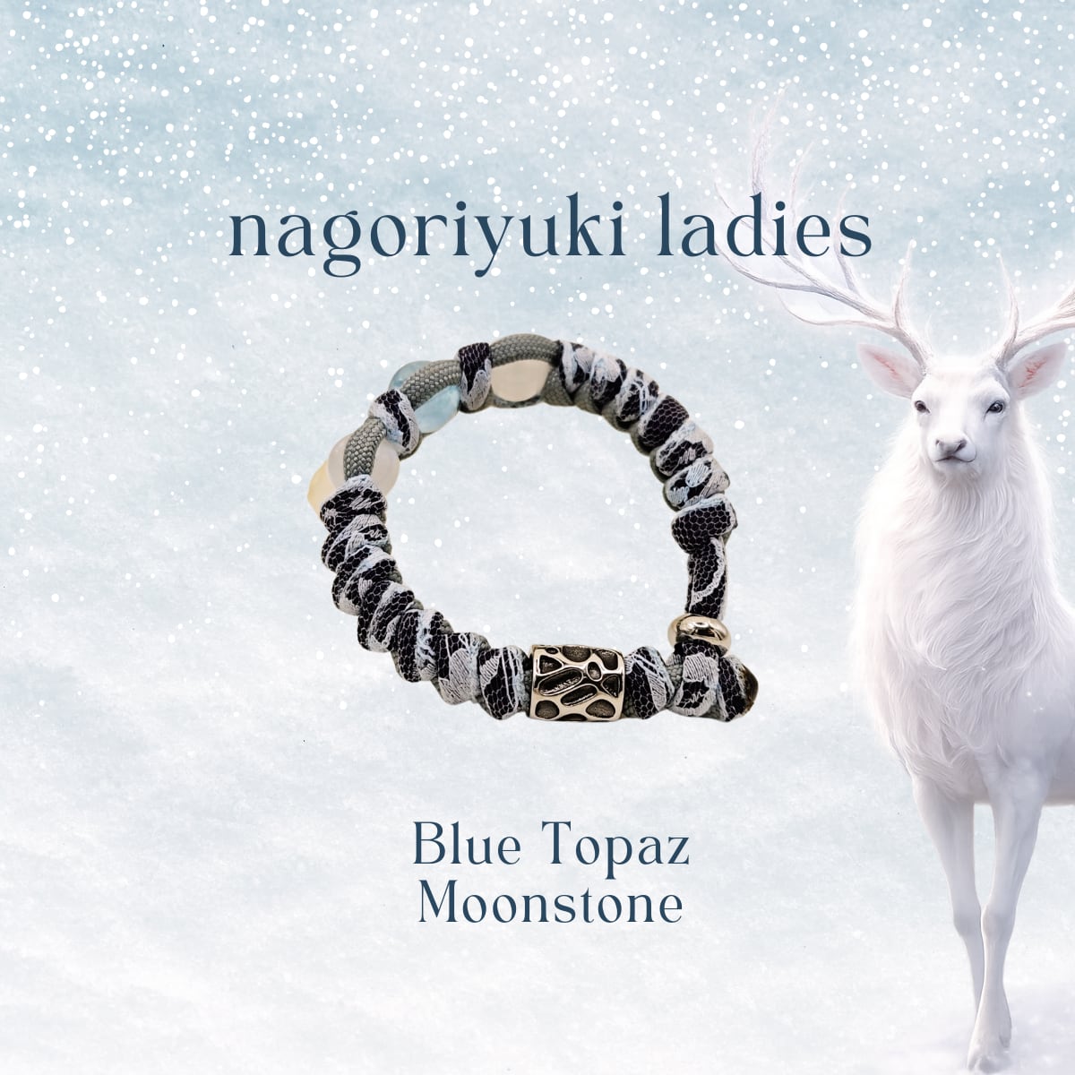 淡くやさしい輝きのムーンストーンと、透明感のあるブルートパーズの組み合わせは、