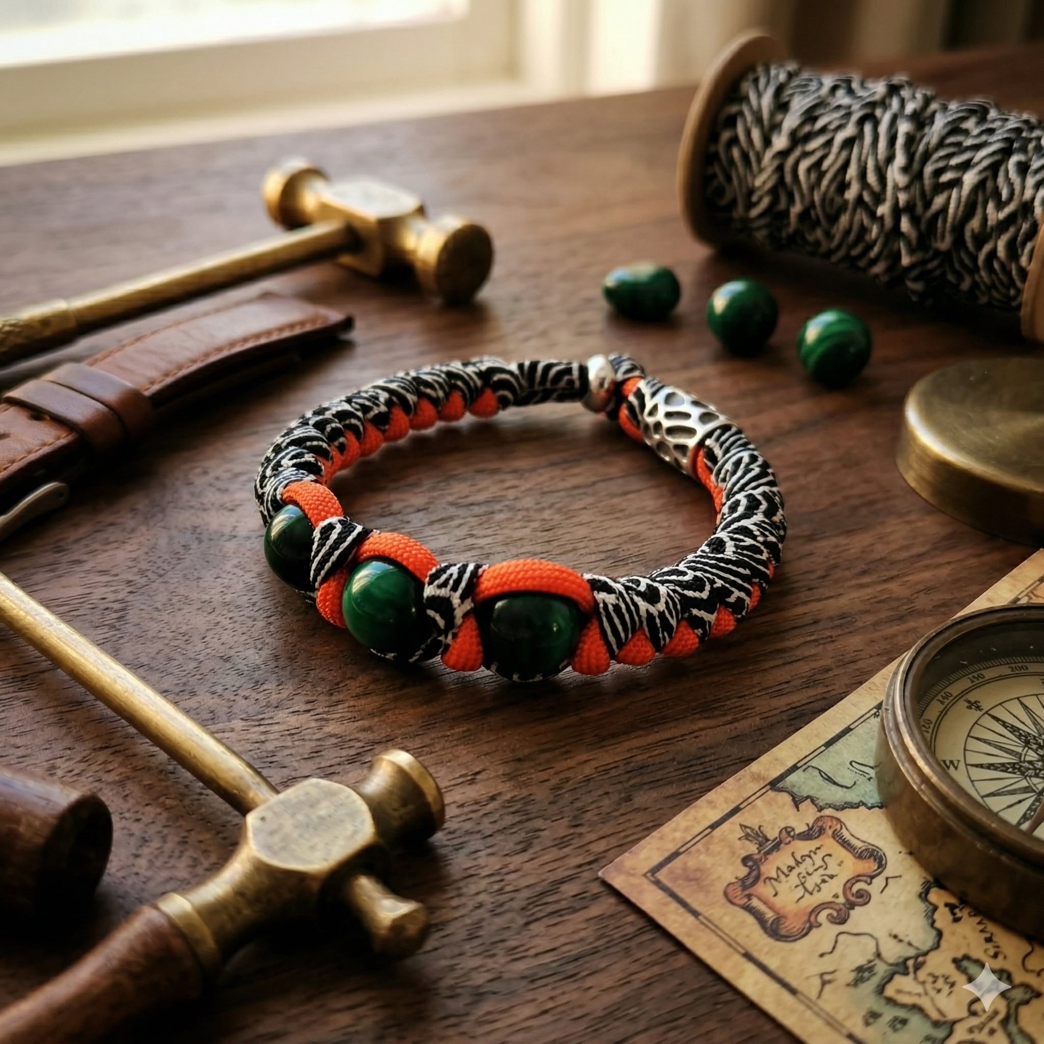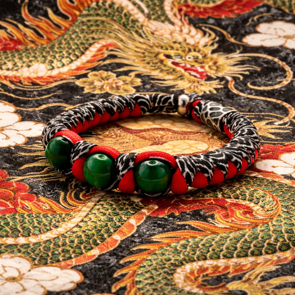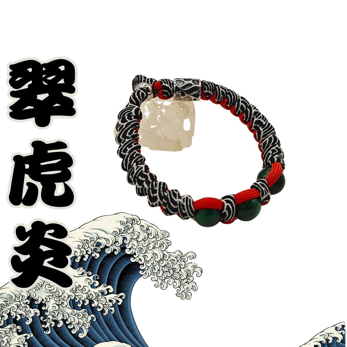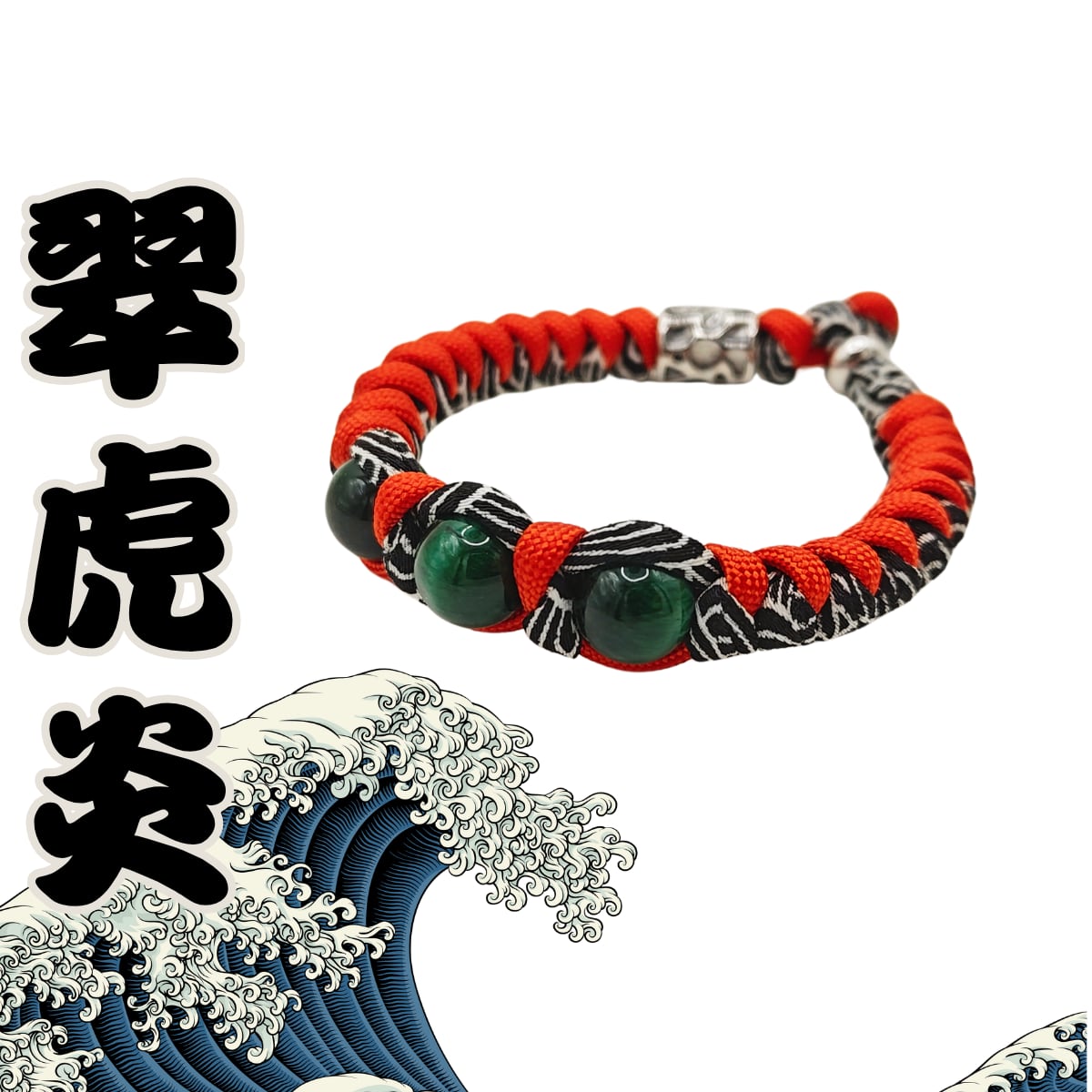 赤いパラコードと黒系の和紐を【産霊編み】で力強く編み込んだ