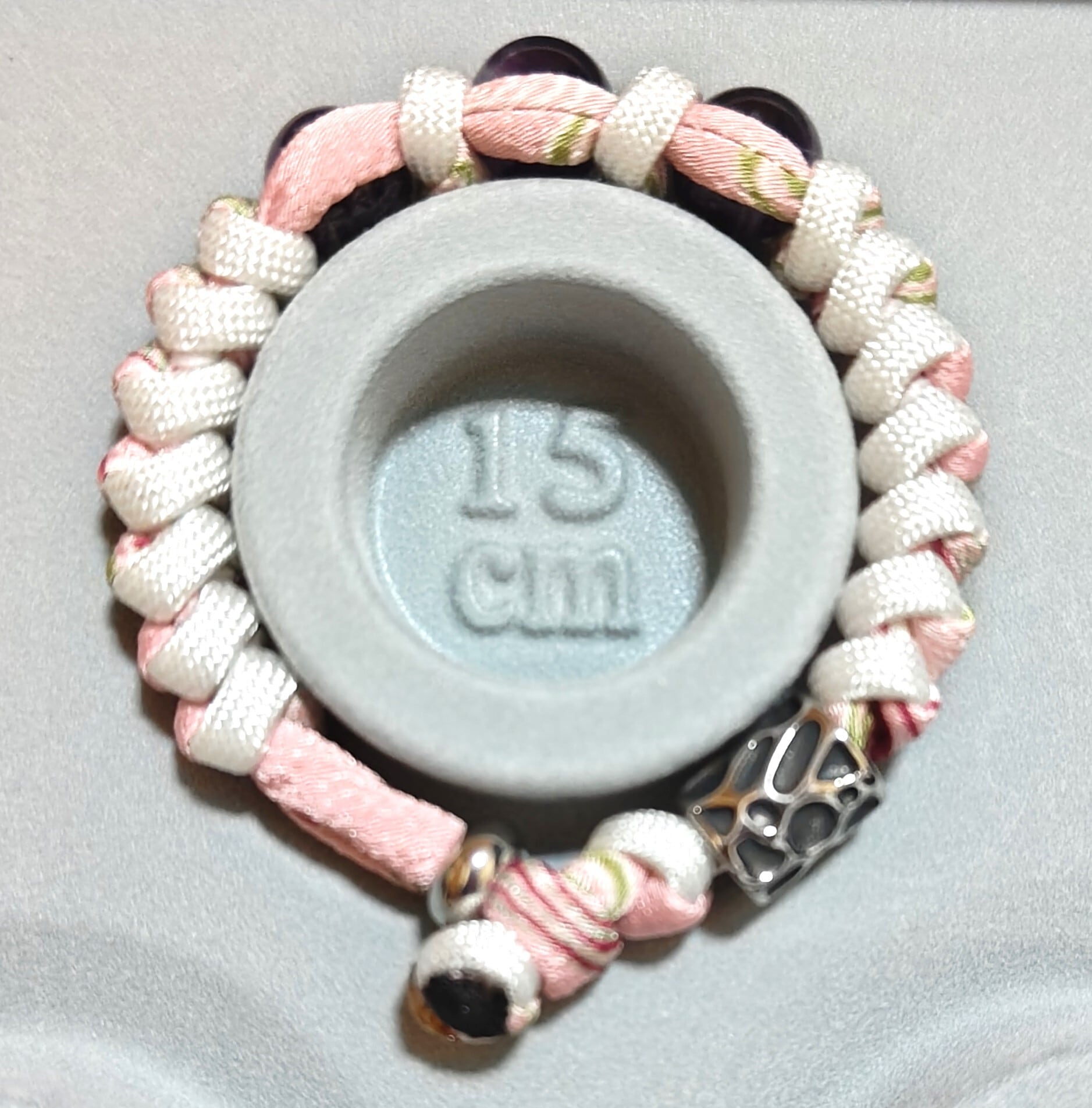 10ミリのアメジスト玉を3つあしらい、その温かみのある紫色が春の柔らかな光を象徴します。白のパラコードとピンクの和柄紐が組み合わさることで、清潔感と優しさ、そして和の趣が際立ち、まるで桜の花びらが舞うような華やかさを演出しています。全体のデザインは、春の訪れを待ち望む心情や、新しい出発への希望を感じさせる、上品でエネルギッシュな一品です